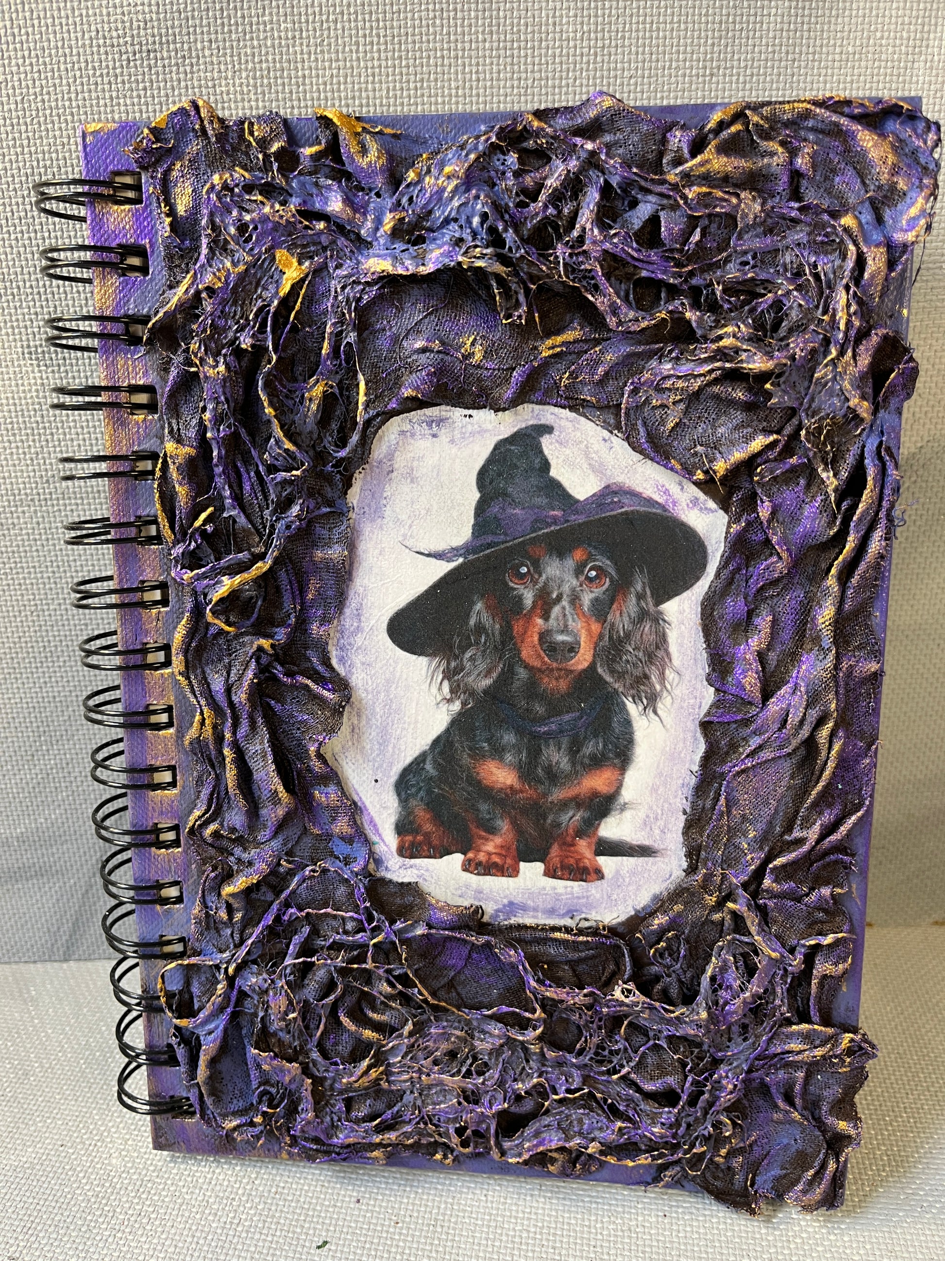 This journal is decorated with fabric sculpting and surrounding a decoupaged Sausage dog in a Witches hat image.